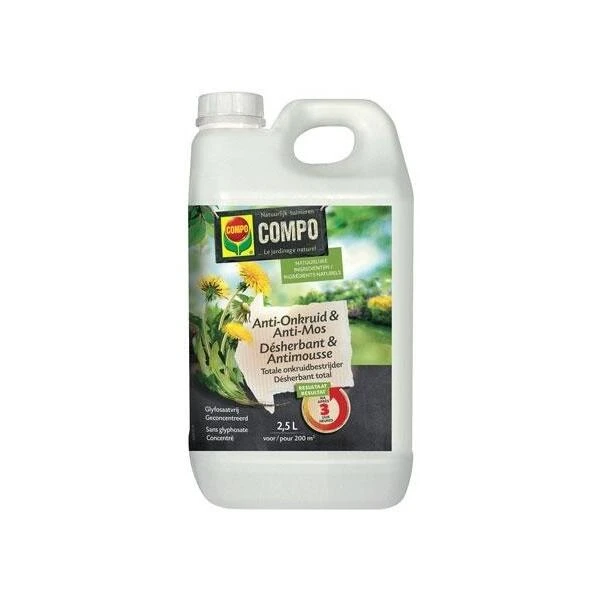 Compo anti-onkruid en anti-mos is geschikt voor de doelgerichte bestrijding van onkruid, grassen en mossen (niet in gazons). Dit product vernietigt de bovengrondse delen van de bespoten planten. Het werkt in op ontwikkelde planten en wordt geabsorbeerd door bladeren en groene stengels.