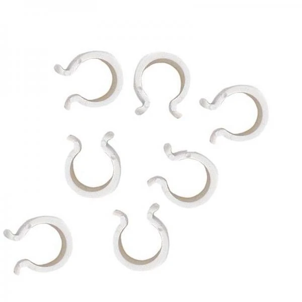 Stevige kunststof klemmen voor het vastzetten van folie, insectengaas, weringsnet of zeil aan buisvormige structuren.
