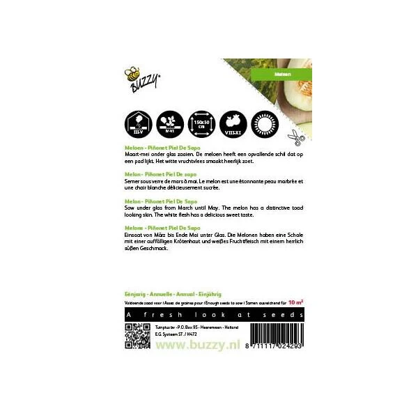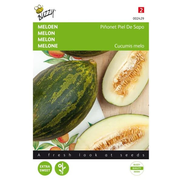 Een Spaanse meloen met wit vruchtvlees en een heerlijk zoete smaak. De schil van de Pinonet Piel De Sapo lijkt op een paddenhuid. Vruchten wegen 2 à 3 kilogram.