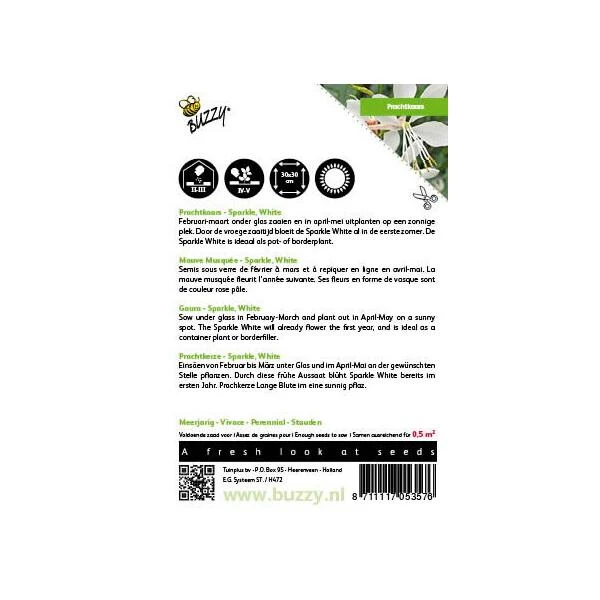 Gaura Sparkle White wordt ook wel prachtkaars genaamd en bloeit rijkelijk met mooie witte bloemen. De plant wordt ongeveer 80 cm hoog en is ideaal voor de zomerborder.